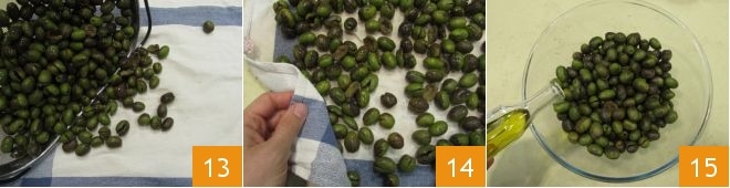 und legen Sie sie dann auf ein sauberes Küchentuch 13 und tupfen Sie sie vorsichtig trocken 14. Übertragen Sie die zerdrückten Oliven in eine Schüssel, würzen Sie sie mit Salz, Olivenöl 15