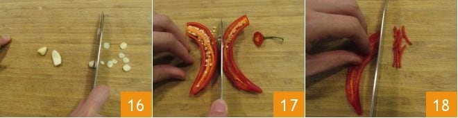 dann die Knoblauchzehen schälen und fein schneiden 16, die frische Chilischote längs halbieren 17, die inneren Samen entfernen und in dünne Streifen schneiden 18.