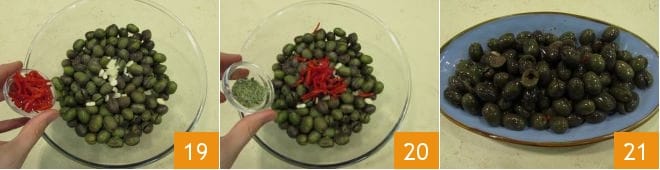 Vervollständigen Sie die Würze mit dem Knoblauch, der Chilischote 19 und dem getrockneten Oregano 20. Mischen Sie alles gut durch und servieren Sie Ihre zerdrückten Oliven als Beilage (oder als Vorspeise, wenn Sie möchten) 21!