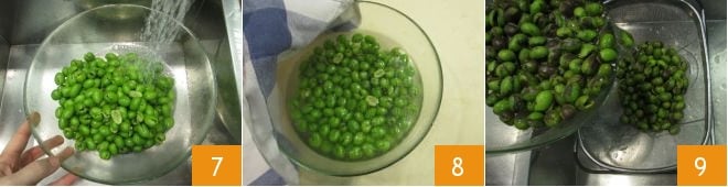 und bedecken Sie sie erneut mit frischem Wasser 7, legen Sie das saubere und trockene Küchentuch erneut auf 8 und bewahren Sie sie weiterhin auf die gleiche Weise auf, indem Sie das Wasser zweimal täglich wechseln, wie angegeben. Wechseln Sie das Wasser der Oliven für 5 Tage unter Einhaltung dieser Zeiten. Am sechsten Tag wird die Färbung und Konsistenz der Oliven bereits anders sein; lassen Sie sie abtropfen 9
