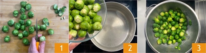 Um den zerdrückten Rosenkohl aus dem Ofen zuzubereiten, waschen und säubern Sie zuerst den Rosenkohl, indem Sie die Basis und eventuell äußere Blätter entfernen 1. Tauchen Sie den Rosenkohl in einen Topf mit kochendem Salzwasser 2 und kochen Sie ihn 8 Minuten lang. Lassen Sie den Rosenkohl abtropfen und im Sieb abkühlen 3.