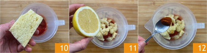Während der Rosenkohl backt, können Sie die Beilagensauce zubereiten: Geben Sie die geschälten Tomaten in ein Gefäß, dann zerreißen Sie das Brot mit den Händen 10. Fügen Sie den Zitronensaft 11 und das Paprikapulver hinzu 12.