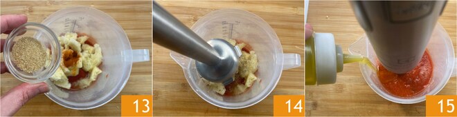 Fügen Sie auch den Rohrzucker hinzu 13, Salz und Pfeffer. Wenn Sie möchten, können Sie auch eine Knoblauchzehe hinzufügen. Beginnen Sie mit einem Stabmixer zu mixen 14, während Sie das Öl nach und nach einfließen lassen 15.