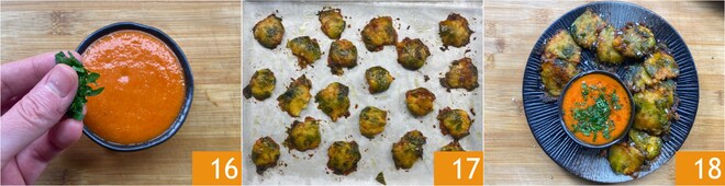 Wenn Sie die richtige Konsistenz erreicht haben, garnieren Sie mit einem Petersilienblatt 16, etwas Öl und ein paar Tropfen Tabasco. Nehmen Sie den Rosenkohl aus dem Ofen 17 und lassen Sie ihn abkühlen, bevor Sie ihn mit einem Spatel vom Blech lösen. Garnieren Sie den zerdrückten Rosenkohl aus dem Ofen mit Flockensalz und servieren Sie ihn mit dem Winter-Salmorejo 18!