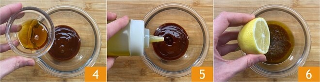 In der Zwischenzeit bereiten Sie die Glasur vor: Geben Sie in einer kleinen Schüssel die BBQ-Sauce, den Ahornsirup 4, das Öl 5, einen Spritzer Zitronensaft 6, Salz und Pfeffer.
