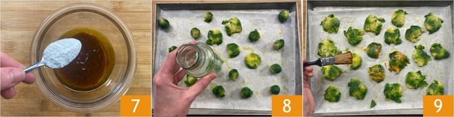 Wenn Sie eine dickere Konsistenz wünschen, fügen Sie auch die Maisstärke hinzu 7, dann gut umrühren. Nehmen Sie den Rosenkohl wieder auf und platzieren Sie ihn auf einem mit Backpapier ausgelegten und geölten Backblech, gut voneinander entfernt. Zerdrücken Sie den Rosenkohl mit dem Boden eines Glases oder eines Einweckglases, achten Sie darauf, ihn zu plätten, ohne ihn zu zerbrechen 8. Bestreichen Sie den zerdrückten Rosenkohl mit der Glasur, achten Sie darauf, auch die Ränder zu bedecken 9. Backen Sie ihn im vorgeheizten statischen Ofen bei 180° für etwa 25 Minuten.