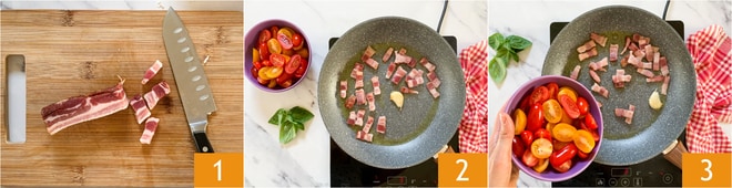 Um die Ziti mit Tomaten, Speck und Stracciatella zuzubereiten, entfernen Sie die Schwarte vom Speck und schneiden Sie ihn in Streifen 1. Waschen Sie die Kirschtomaten und halbieren Sie sie. Erhitzen Sie eine angedrückte Knoblauchzehe mit Schale in einer Pfanne mit dem Öl, fügen Sie den Speck hinzu und braten Sie ihn kurz an 2. Geben Sie die Kirschtomaten dazu 3.