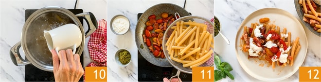 Halten Sie etwas Kochwasser zurück 10. Lassen Sie die Ziti abtropfen und geben Sie sie in die Pfanne mit der Sauce 11, schwenken Sie sie und passen Sie die Cremigkeit mit ein paar Esslöffeln Kochwasser der Pasta an. Servieren Sie mit der Stracciatella und dem Pistazien-Crumble 12.