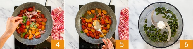 Würzen Sie mit ein paar Basilikumblättern 4, Salz und Pfeffer und kochen Sie für 7 Minuten, dann entfernen Sie den Knoblauch 5. Stellen Sie einen Topf mit gesalzenem Wasser auf den Herd und bringen Sie es zum Kochen, um die Ziti zu kochen. Bereiten Sie das Pistazien-Crumble zu: Hacken Sie die Pistazien in einem Mixer 6.