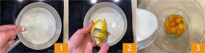 Um die Zitronen-Profiteroles zuzubereiten, beginnen Sie mit der Creme: Geben Sie die Milch in einen Topf, würzen Sie sie mit einer Prise Salz 1 und der Zitronenschale 2 und bringen Sie alles zum Kochen. In einer separaten Schüssel die Eigelbe und den Zucker zusammengeben 3 und mit einem Schneebesen verrühren, ohne Luft einzuarbeiten.