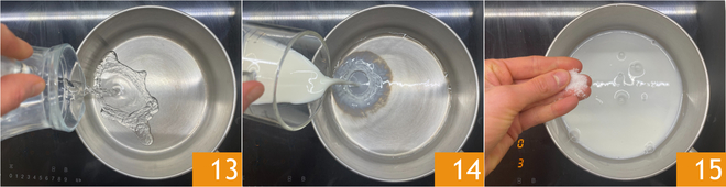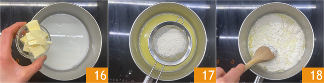 In der Zwischenzeit kümmern Sie sich um den Brandteig: Geben Sie in einen Topf mit dickem Boden das Wasser 13, die Milch 14 und eine Prise Salz 15.