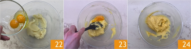 Rühren Sie ein Ei nach dem anderen unter 22 und mischen Sie gut, damit es vollständig aufgenommen wird 23. Sobald Sie einen homogenen Teig erhalten haben 24, füllen Sie ihn in einen Spritzbeutel mit einer 12 mm glatten Tülle.