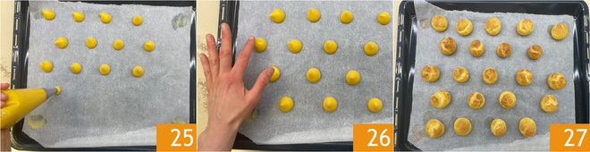 Belegen Sie ein Backblech mit Backpapier und spritzen Sie Tupfen mit einem Durchmesser von 3 cm 25. Befeuchten Sie die Spitze eines Fingers mit Wasser und drücken Sie die Spitzen der Tupfen leicht flach; so erhalten Sie eine schön runde Form 26. Backen Sie im vorgeheizten Ober-/Unterhitze-Ofen bei 200 °C für etwa 20–22 Minuten. Nach dem Backen herausnehmen und vollständig auskühlen lassen 27.