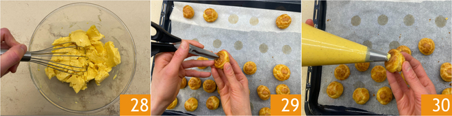 Nachdem die Creme abgekühlt ist, schlagen Sie sie kurz mit einem Schneebesen, um sie geschmeidig zu machen 28, und füllen Sie sie in einen Spritzbeutel, ebenfalls mit einer 12 mm glatten Tülle. Schneiden Sie mit der Spitze einer Schere ein Loch an der Unterseite jedes Windbeutels 29. Führen Sie die Tülle in das Loch ein und füllen Sie die Windbeutel großzügig mit der Creme 30. Die übrig gebliebene Puddingcreme wird für die Glasur verwendet.