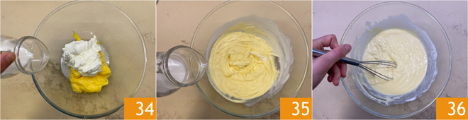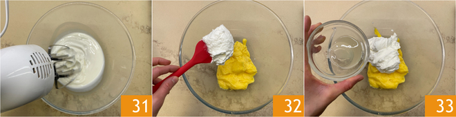 Weiter mit der Glasur: Schlagen Sie 150 g Sahne mit einem Handrührgerät steif 31. In einer Schüssel die geschlagene Sahne mit der restlichen Zitronencreme vermengen 32 und dann den Limoncello hinzufügen 33.