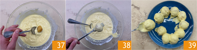 Tauchen Sie nur wenige Windbeutel gleichzeitig in die Glasur 37 und heben Sie sie mit einer Gabel heraus, damit die überschüssige Glasur abtropfen kann 38. Platzieren Sie die glasierten Windbeutel nach und nach auf der Servierplatte, um die klassische Pyramide zu formen 39.