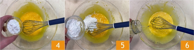 Geben Sie die Maisstärke 4 und die Reismehlstärke 5 dazu. Sobald die Pulver aufgenommen sind, fügen Sie den Zitronensaft hinzu 6 und rühren erneut um.