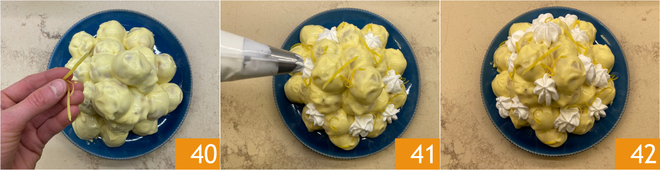 Nachdem alle Windbeutel glasiert sind, schlagen Sie 100 g Sahne mit Puderzucker für die Dekoration steif. Garnieren Sie die Windbeutel-Pyramide mit Zitronenzesten 40 und füllen Sie die Lücken mit Sahnetupfen, dazu einen Spritzbeutel mit Sterntülle verwenden 41. Stellen Sie alles für mindestens 2–3 Stunden kalt, damit es fest wird. Ihre Zitronen-Profiteroles sind servierbereit 42!
