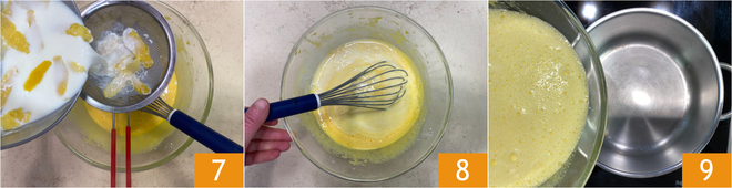 Gießen Sie nun die heiße Milch durch ein Sieb in die Schüssel 7 und verrühren Sie alles mit einem Schneebesen 8. Füllen Sie die Mischung in einen Topf mit dickem Boden um (verwenden Sie nicht den Topf, in dem Sie die Milch erhitzt haben, sonst könnte die Creme anbrennen) 9.