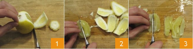 Um den Zitronenkuchen zuzubereiten, schälen Sie zuerst die Zitronen: Entfernen Sie die Schale mit einem glatten Messer und achten Sie darauf, auch den weißen, bittereren Teil zu entfernen 1, dann halbieren Sie das Fruchtfleisch 2 und ziehen Sie mit dem Messer die Segmente vom Schneidebrett ab, um das Fruchtfleisch von den weißen Häutchen zu trennen 3: Insgesamt benötigen Sie 170 g Zitronenfruchtfleisch.