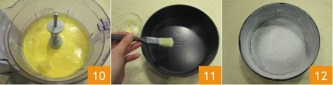 dann mixen Sie alles, bis Sie eine cremige und gleichmäßige Masse erhalten 10. Nehmen Sie jetzt eine Springform mit 20 cm Durchmesser und fetten Sie sie gründlich ein 11, dann mehlen Sie sie 12.