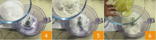 Heizen Sie den Ofen im statischen Modus auf 180° vor und geben Sie alle Zutaten in einen Mixer mit Klingen: Fügen Sie das Backpulver, den Zucker 4, das Mehl 5 und das Zitronenfruchtfleisch 6 hinzu.