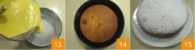 Gießen Sie den Teig hinein 13 und backen Sie ihn im vorgeheizten statischen Ofen bei 180° für etwa 60 Minuten auf der unteren Schiene. Sobald er gebacken ist (machen Sie immer den Stäbchentest am Ende der Backzeit), nehmen Sie den Kuchen aus dem Ofen und lassen Sie ihn in der Form abkühlen 14, dann stürzen Sie ihn und bestäuben Sie ihn mit Puderzucker. Ihr duftender Zitronenkuchen ist bereit zum Genießen 15!