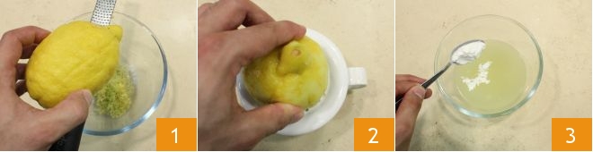 Beginnen Sie die Zubereitung des lemon curd, indem Sie die Schale der 3 Zitronen abreiben 1 und auch den Saft auspressen und filtern 2, fügen Sie die gesiebte Maisstärke hinzu 3.