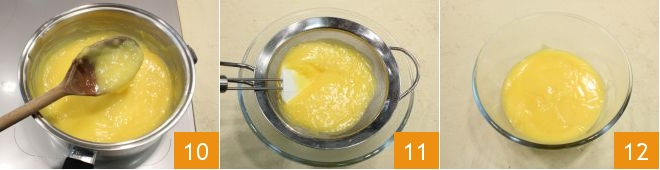 Um zu erkennen, wann die Creme fertig ist, tauchen Sie einen Holzlöffel ein 10, wenn Sie sehen, dass die Creme nicht mehr abgleitet, ist es Zeit, die Hitze auszuschalten. Nehmen Sie jetzt ein sehr feines Sieb und sieben Sie die Creme, um die Zitronenschale und eventuelle Klumpen zu entfernen 11, Ihr lemon curd ist fertig 12, um Ihre Desserts zu füllen.