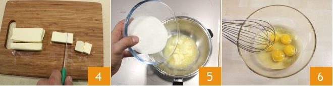 Schneiden Sie die Butter in Stücke 4, geben Sie sie in einen Kochtopf mit doppeltem Boden für das Wasserbad und schmelzen Sie sie bei schwacher Hitze, dann fügen Sie den Zucker hinzu 5 und rühren Sie mit einem Löffel um. In einer separaten Schüssel die Eier mit einem Schneebesen verquirlen 6
