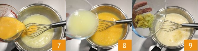 und gießen Sie sie in die Creme 7, während Sie weiter rühren, fügen Sie auch den Zitronensaft hinzu, in dem Sie die Maisstärke aufgelöst haben 8, die abgeriebene Zitronenschale 9 und rühren Sie weiter, während Sie die Creme bei schwacher Hitze eindicken, halten Sie die Hitze sehr niedrig und lassen Sie nur das Wasser im Wasserbad leicht köcheln, um zu vermeiden, dass das Ei gerinnt; die Creme sollte niemals kochen.