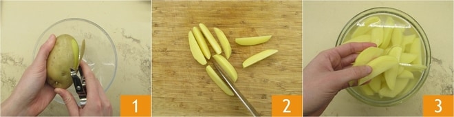 Um die Zitronenkartoffeln zuzubereiten, beginnen Sie damit, die Kartoffeln zu schälen 1. Schneiden Sie sie in 8 Spalten 2 und legen Sie sie nach und nach in eine Schüssel mit kaltem Wasser 3. Lassen Sie sie so lange einweichen, bis die Marinade vorbereitet ist.
