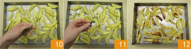 Fügen Sie den Rosmarin 10 und den Thymian 11 hinzu. Im vorgeheizten statischen Ofen bei 230 °C 40 Minuten lang backen, dann den Umluftmodus einschalten, die Temperatur auf 210 °C senken und die Zubereitung weitere 20 Minuten backen. Herausnehmen und die Zitronenkartoffeln servieren 12.