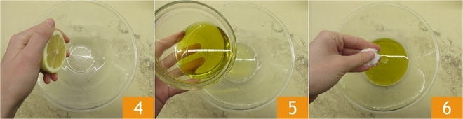 In einer Schüssel den Saft von zwei Zitronen 4, das Öl 5 und eine Prise Salz 6 vermengen.