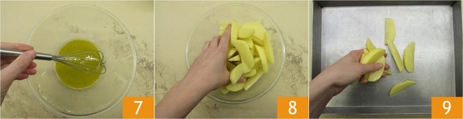 Mit einem Schneebesen emulgieren 7, dann die Kartoffeln abtropfen lassen und in die Schüssel geben. Gut mischen 8 und etwa 30 Minuten einwirken lassen. Nach dieser Zeit auf ein Backblech geben, zusammen mit ihrer Marinade 9.