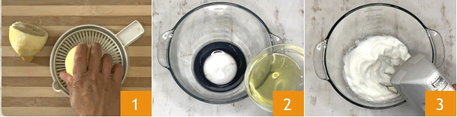 Um den Zitronenkuchen zuzubereiten, reiben Sie zuerst die Schale von 2 Zitronen ab und pressen Sie dann den Saft aus; Sie benötigen etwa 120 ml 1. Trennen Sie nun die Eigelbe von den Eiweißen, geben Sie Letztere in eine Schüssel 2 und schlagen Sie sie mit 20 g Zucker steif 3, dann beiseite stellen.