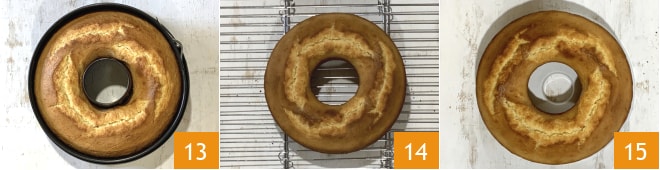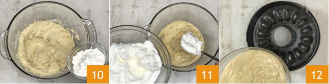 Fügen Sie auch die Maisstärke 10 und das Backpulver hinzu und arbeiten Sie weiter mit den Rührbesen, um die Mischung homogen zu machen. Zum Schluss die steif geschlagenen Eiweiße 11 hinzufügen und vorsichtig mischen, um sie zu integrieren, ohne die Mischung zu entlüften. Gießen Sie den erhaltenen Teig in eine vorher eingefettete Kuchenform mit einem Durchmesser von 24 cm 12. Backen Sie in einem vorgeheizten statischen Ofen bei 180° etwa 50 Minuten; wenn er zu dunkel wird, können Sie ihn nach 30 Minuten mit einem Blatt Aluminiumfolie abdecken.