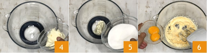 In eine andere Schüssel geben Sie die Butter 4 und 200 g Zucker 5 und schlagen Sie mit den Rührbesen etwa 5 Minuten lang, dann fügen Sie die Eigelbe einzeln hinzu, während Sie die Rührbesen laufen lassen 6.