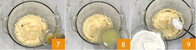 Fügen Sie nun die Zitronenschale 7 und den Saft 8 hinzu und mischen Sie eine weitere Minute, dann fügen Sie das Mehl löffelweise hinzu 9.