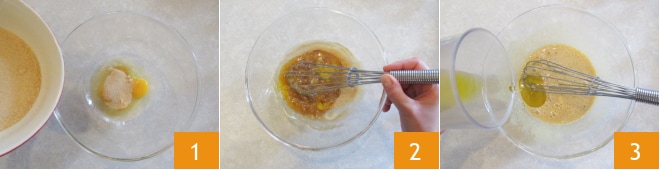 Um den Zitronen-Kastenkuchen ohne Butter zuzubereiten, beginnen Sie damit, in einer Schüssel die Eier und 180 g braunen Zucker zu bearbeiten 1. Schlagen Sie ein paar Augenblicke mit einem Schneebesen, bevor Sie das Öl in einem dünnen Strahl hinzufügen 3.