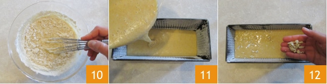 Arbeiten Sie weiter mit dem Schneebesen, vermengen Sie alles gut, um eine flüssige und homogene Masse zu erhalten 10. Gießen Sie es in eine mit Öl gefettete und bemehlte Form. Die Maße der Form sind unten 22x8 cm, während sie oben 25x10 cm misst 11. Streuen Sie die Oberfläche mit grob gehackten Mandeln 12.
