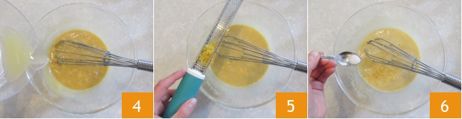 Sobald das Fett aufgenommen wurde, geben Sie den Saft 4 und die abgeriebene Zitronenschale 5 dazu. Während Sie weiterrühren, fügen Sie das Salz 6 hinzu,