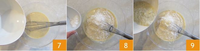 die Mandelmilch 7, das Mehl Type 2, das Backpulver 8 und das Mandelmehl 9.