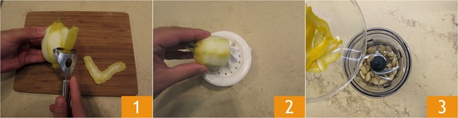 Um das Zitronenpesto zuzubereiten, entfernen Sie die Schale der Zitrone mit einem Sparschäler 1, dann pressen Sie den Saft aus 2. Geben Sie die geschälten Mandeln und die Zitronenschale in einen Mixer 3.