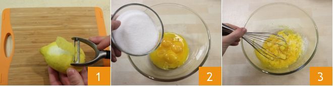 Um die Zitronensahne zuzubereiten, nehmen Sie die Schale der Zitronen ab und achten Sie darauf, nicht den weißen Teil zu nehmen 1 (Sie können eine halbe Zitrone für das spätere Reiben nach dem Kochen der Sahne beiseite lassen) und geben Sie die Schale in einen Topf, in den Sie die Milch gegeben haben. Zünden Sie das niedrige Feuer an und lassen Sie die Milch erwärmen (sie sollte nicht zum Kochen kommen). In der Zwischenzeit geben Sie die Eigelbe und den Zucker 2 in eine Schüssel und schlagen die Mischung mit einem Schneebesen 3.