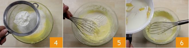 Sie müssen eine homogene Creme erhalten, bevor Sie das Mehl und die gesiebte Stärke hinzufügen 4; mischen Sie mit dem Schneebesen, um die Pulver zu mischen 5, dann fügen Sie die erwärmte Milch hinzu 6.