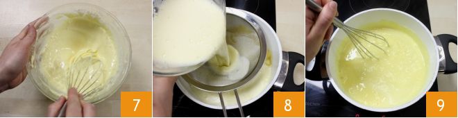 Mischen Sie kräftig, um eine homogene und flüssige Mischung zu erhalten 7, dann gießen Sie sie erneut in den Topf und filtern sie mit einem feinen Sieb, um Klumpenbildung zu vermeiden 8. Zünden Sie das niedrige Feuer an und kochen Sie die Sahne, indem Sie kontinuierlich mit dem Schneebesen rühren 9, bis sie eingedickt ist (es dauert etwa 15 Minuten).
