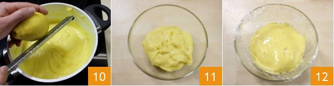 Wenn sie eingedickt ist, können Sie vor dem Ausschalten des Feuers die Schale einer Zitrone reiben, wenn Sie möchten, um zusätzliches Aroma zu verleihen 10; dann schalten Sie das Feuer aus und geben die Sahne in eine Schüssel 11, decken Sie sie dann mit Frischhaltefolie ab 12 und lassen sie abkühlen, bevor Sie sie in den Kühlschrank stellen und verwenden können!