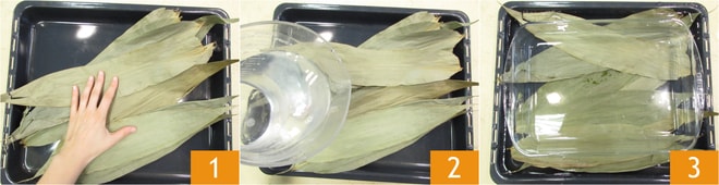 Um die Zongzi zuzubereiten, legen Sie zuerst die Bambusblätter in einen ausreichend großen Behälter 1, bedecken Sie sie mit Wasser 2 und legen Sie ein Gewicht darauf, damit sie eingetaucht bleiben 3. Lassen Sie sie 12 Stunden einweichen.