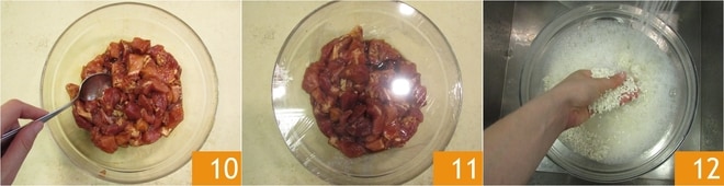 Gut mischen 10, mit Folie abdecken 11 und 2 Stunden marinieren lassen. Waschen Sie in der Zwischenzeit den Reis 2-3 Mal unter fließendem Wasser 12.